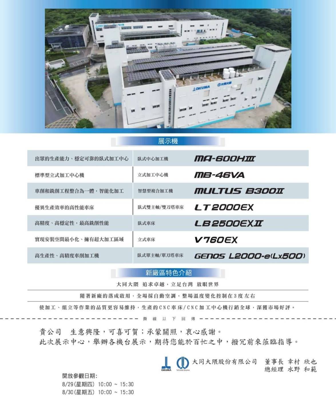 OKUMA(大同大隈股份有限公司)開放參觀日資訊~