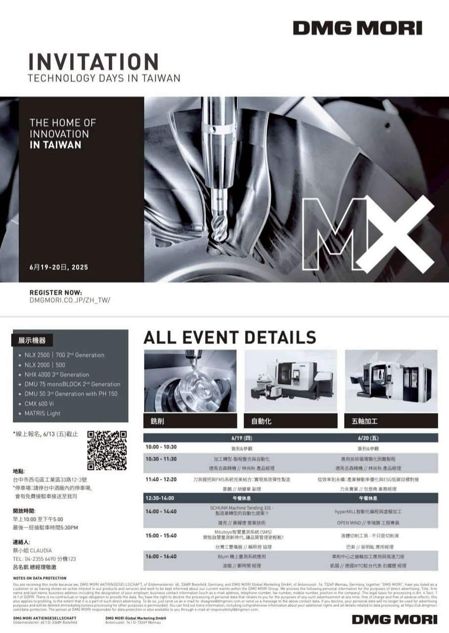 世界知名品牌 “德馬吉森精機” 將於6/19,20日兩天在台灣分公司舉辦展示,WTO並將於6/20日下午16:00~16:40做 “#車削中心之齒輪加工應用與高速刀座” 專題演講,歡迎您蒞臨現場聆聽。